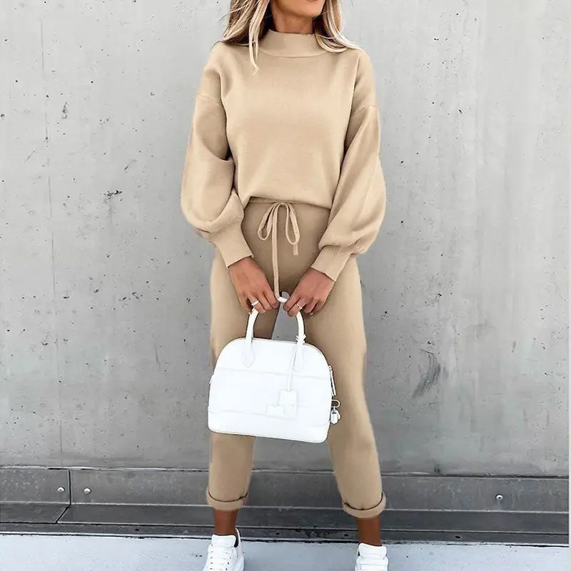 Autumn and Winter Women's Hoodie Set, High Neck Casual Solid Color Pants Two-piece Set